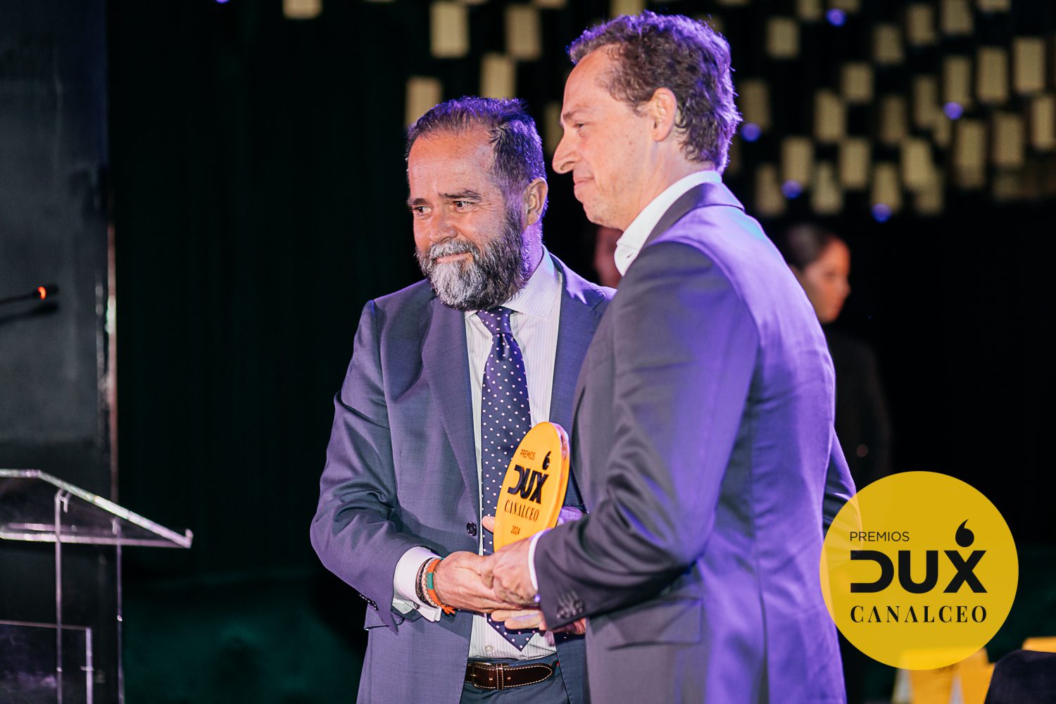 Alfredo García Borreguero, CEO de Hitachy Energy, entrega el galardón DUX por el futuro a Ventura Barba, CEO de Advanced Music.