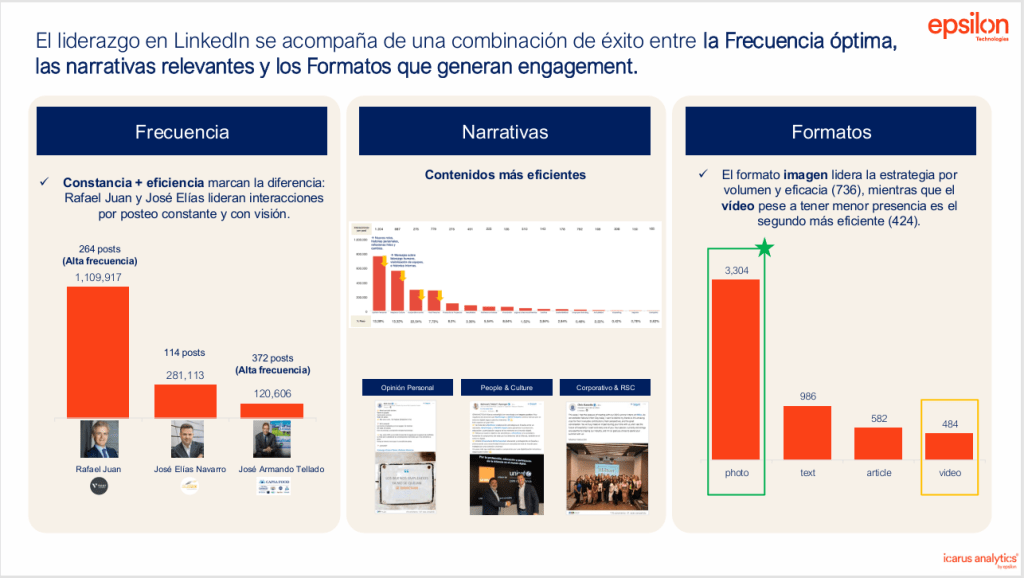 Las publicaciones que reconocen al equipo o hablan de cultura organizativa concentran una gran parte de las interacciones. El CEO aparece como altavoz del talento colectivo, no como protagonista del relato.