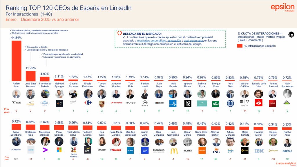 Ahora aparece una nueva clasificación que amplía esa conversación sobre cómo se ejerce el liderazgo en el siglo XXI. La consultora martech Epsilon Technologies ha presentado su Ranking de CEOs en LinkedIn, un análisis que mide la llamada cuota de atención digital de los líderes empresariales en España.